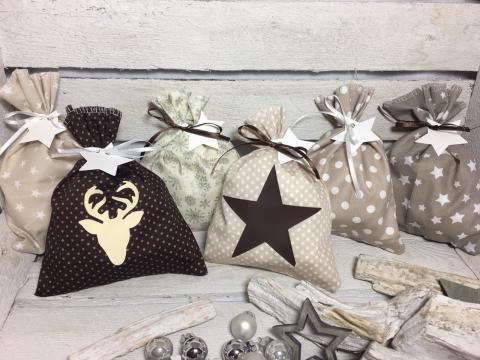 24 schöne und liebevoll genähte Baumwollsäckchen,farblich abgestimmt und einige mit bedruckten Motiven.