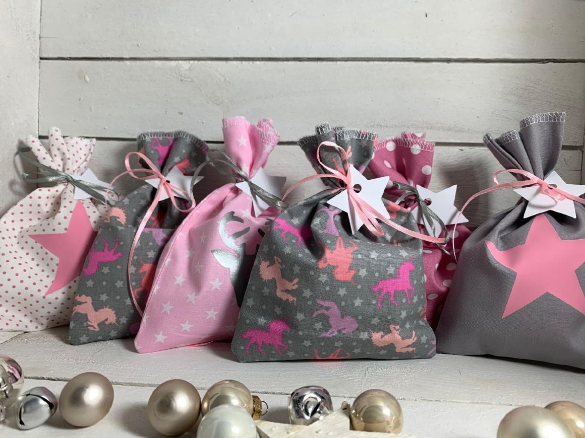 Adventskalender 24 Säckchen Einhorn grau rosa pink
