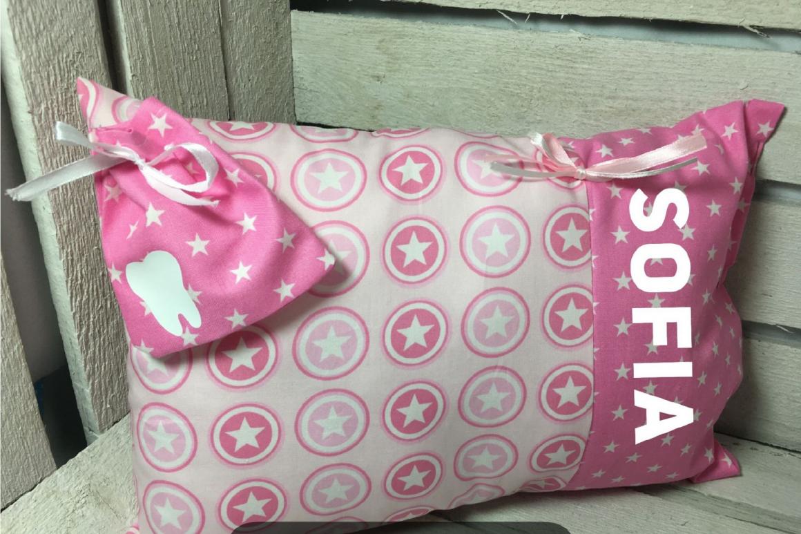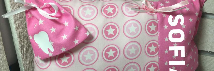 am Kissen ist mit einem Druckknopf ein kleines Beutelchen für die Zahnfee befestigt.