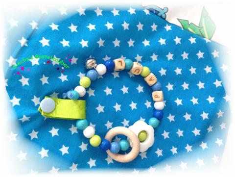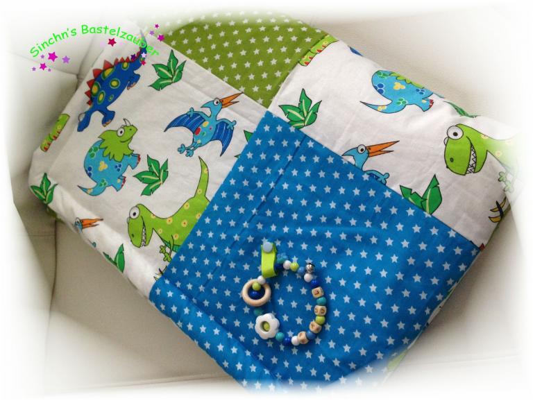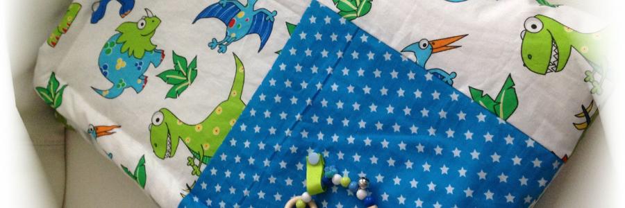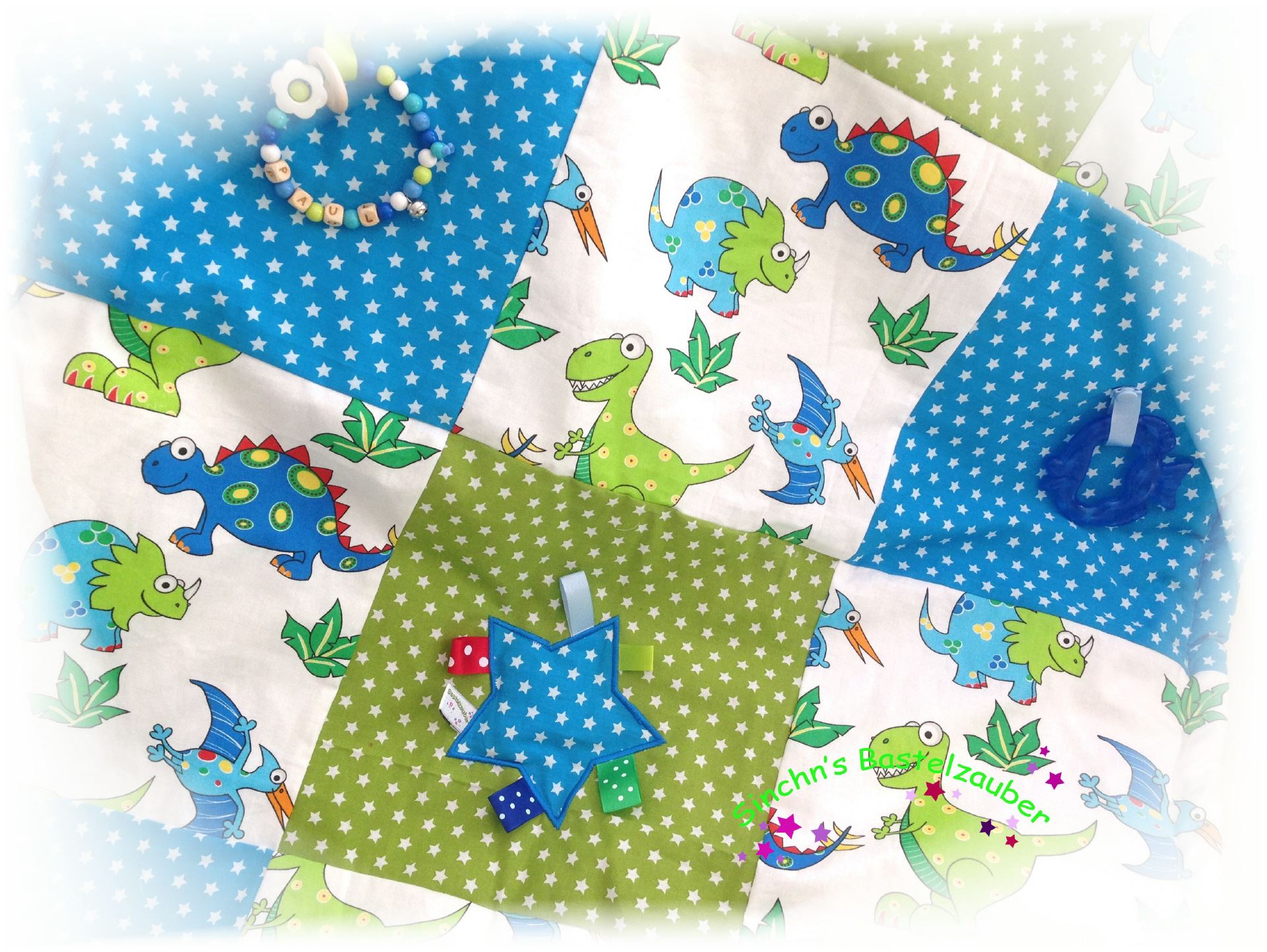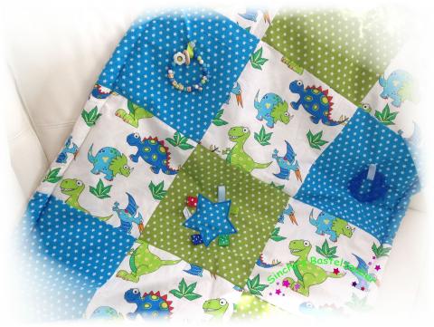 Auf der Decke befindet sich ein Knisterelement mit Label zum fühlen und staunen. Sowie ein Silikonbeissring und ein Personalisierter Greifling....