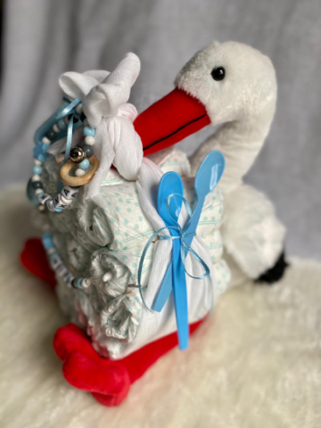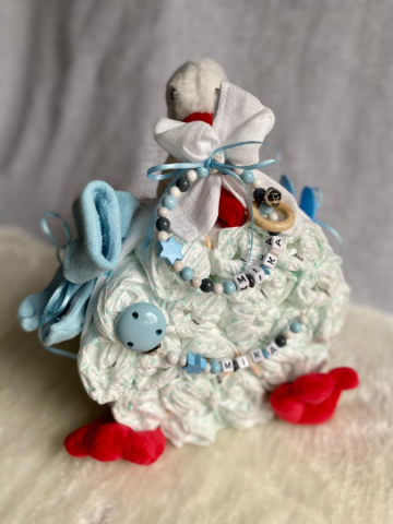 Die Windeltorte wird in Klarsichtfolie verpackt geliefert.